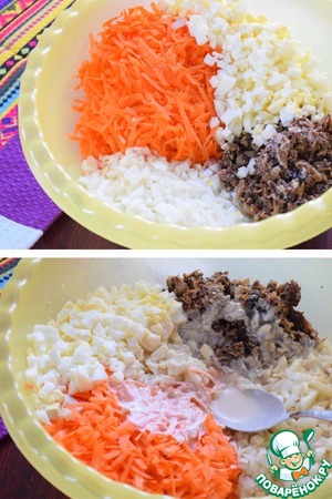 Все ранее приготовленные продукты выкладываем в большую чашку, добавляем соус-заправку и перемешиваем. Пробуем на вкус. При надобности досаливаем и перчим. Даем салату настояться минут 10 - 15 минут.