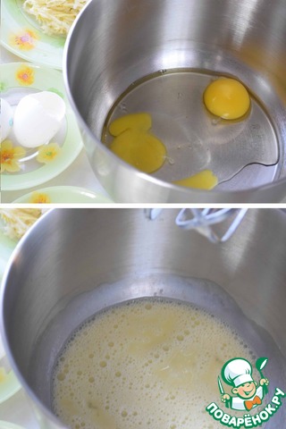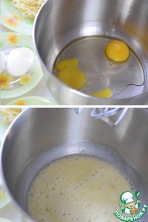 Яйца взбить миксером в легкую пену (1-2 минуты).