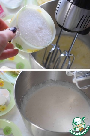 Не прекращаю взбивать, небольшими порциями всыпать сахар. Взбить до бела.
