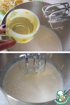 Не прекращая взбивания, тонкой струйкой влить растительное масло. Взбить. Должна получится пышная, чуть плотная масса.