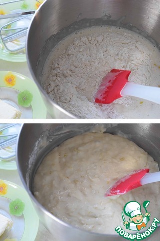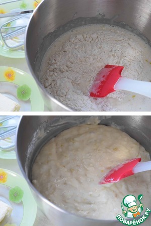 В несколько приемов добавить просеянную муку и разрыхлитель. Перемешать тесто.