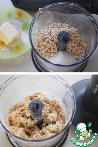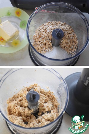 Пока печется кекс, приготовим овсяный штрейзель: в чашу блендера высыпать хлопья, сахар и холодное сливочное масло. Пробить в крошку. Убрать в холодильник.