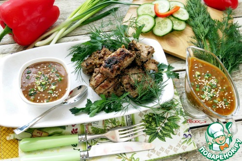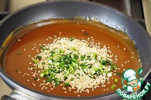 Как только по краям появятся пузырьки, а соус загустеет, убираем с плиты. Даём ему остыть, добавляем зелёный лук и кунжут. Хорошо перемешиваем, всё соус готов.