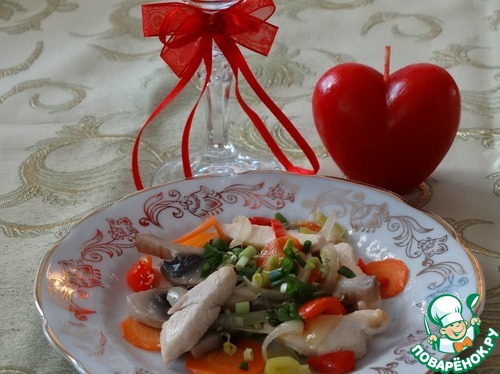 Смешиваем куриное филе, отваренные шампиньоны, обжаренные овощи, нарезанную петрушку, соломку острого перца, зеленый лук и черемшу в миске, заливаем горячим маринадом, перемешиваем.