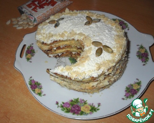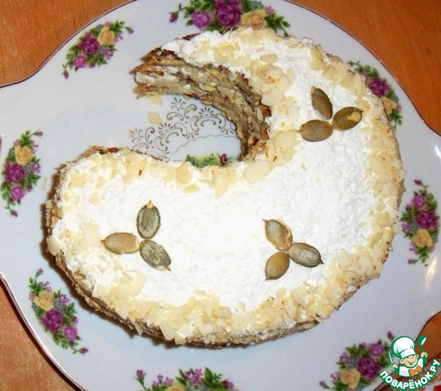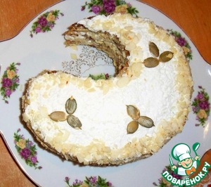 Для украшения используем миндальную крошку и тыквенные семечки. Торт ставим в холодильник на 2 часа.