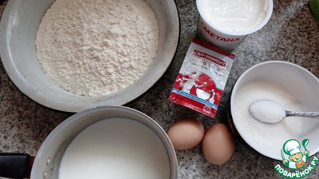 Молоко подогреть. Взять от общего количества 2 стакана теплого молока, добавить к муке. Всыпать соль, сахар, добавить яйца. Оставить тесто под крышкой на 5 часов для подъема. Подниматься оно будет очень активно и даже попытается сбежать, поэтому 3-4 раза нужно его обмять.