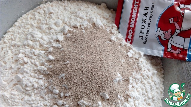 Готовим тесто. В муку насыпать дрожжи Саф-Момент.