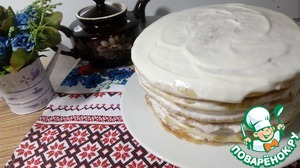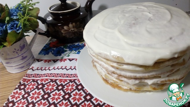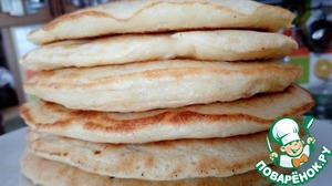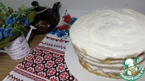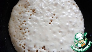 Оставшееся молоко (1,5 стакана) вскипятить, влить в тесто. Размешать и сразу выпекать толстые блины-коржи.