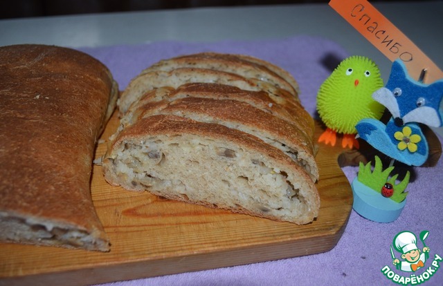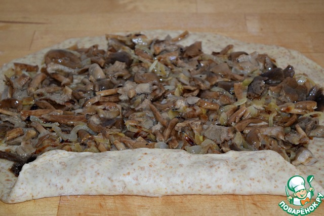 Выложить тесто на рабочую поверхности, слегка присыпанную мукой, обмять и раскатать в пласт толщиной 5-7 мм. Выложить на тесто грибную начинку, отступив немного от краев.