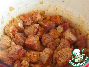 В кастрюле с толстым дном обжарить лук на подсолнечном масле. Добавить мясо, посолить, поперчить, насыпать сладкую паприку, перемешать. Накрыть крышкой и на самом маленьком огне тушить примерно 30 мину.