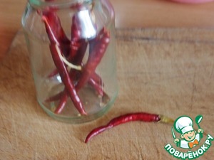 Перец чили мелко порезать. Тут нужно быть осторожным и руководствоваться своими вкусами. Если перец попался очень острый, то удалите семена.