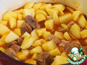 Очищенный картофель нарезать довольно крупно, добавить к мясу, перемешать. Добавить воду, чтобы она почти покрывала картофель.