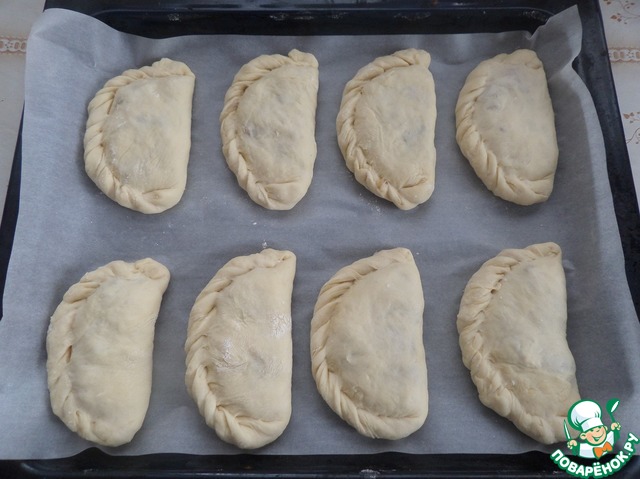 Выпекаем пирожки в разогретой духовке 20-30 минут при 180 градусах. Сбрызгиваем готовые пирожки водой и накрываем полотенцем на 10 минут.