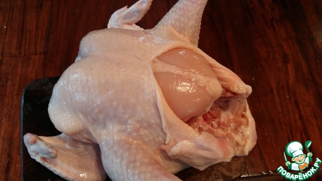 • Курицу помыть и обсушить. Пальцами отделить кожу в районе грудки, кухонными ножницами вырезать грудку вместе с костями. Я это сделала, чтобы поместилось больше начинки.