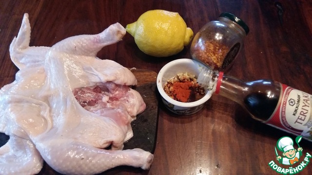 • Приготовить маринад. Чеснок мелко нарубить, выдавить сок и натереть цедру 1/2 лимона, добавить копченую паприку, красный острый перец, томатный порошок, молотый копченый бекон и все смешать с соусом-маринадом "Терияки" от ТМ "Киккоман".