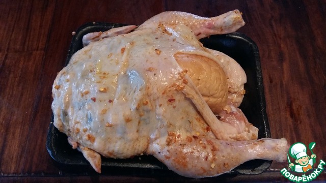 • Курицу слегка посолить, натереть маринадом и оставить на 2 - 4 часа.