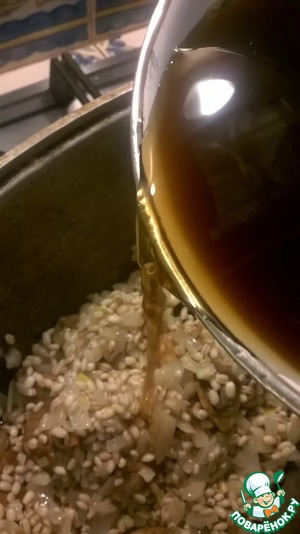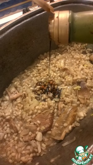 Засыпаем ошпаренную перловку, добавляем водичку с грибов по чуть-чуть, (как в приготовлении ризотто), варим на чуть меньше среднего огне, добавлям жидкость по мере выпаривания. Следите, чтобы не подгорело, все время нужно помешивать.