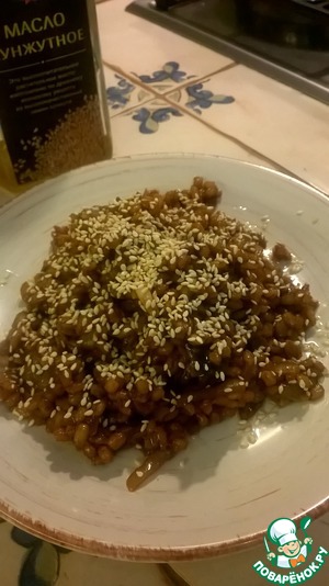 Сервируем блюдо. Выкладываем наше орзотто с грибами на тарелку, сбрызгиваем кунжутным маслом и посыпаем кунжутными семечками (вкуснее будет их обжарить) Еще мне не хватило немного остринки, если предпочитаете перец чили, он был бы здесь уместен.