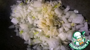 Порезать лук и чеснок (чем больше лука, тем блюдо получается более сочным), обжарить на растительном масле до прозрачности