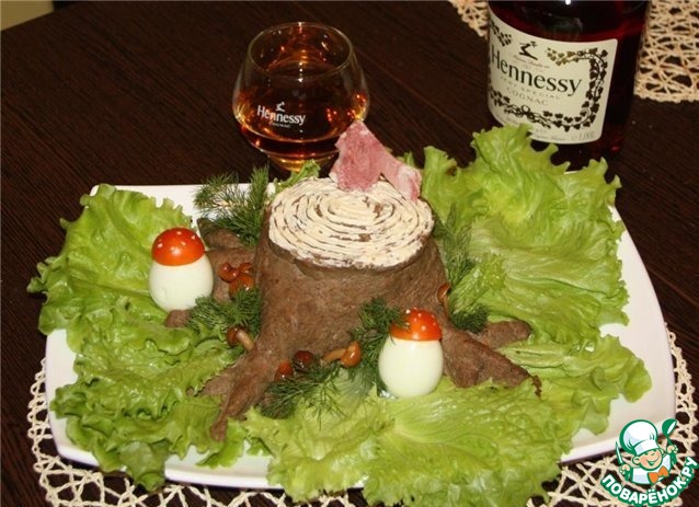 Из паштета сформировать пенёк ( на руки лучше надеть перчатки), верх смазать сливочным маслом, вилкой делаем кольца. Грибочки делаем из варёных яиц, ставим точки на шляпках маслом. Из колбасы вырезать топорик и воткнуть в пенёк. Вокруг пенёчка разложить зелень и грибочки из банки. Поставить охлаждаться на холод.