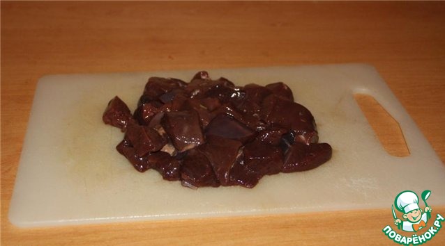 Печень режем небольшими кусочками. Обжариваем на растительном масле с луком и морковкой, солим, перчим, добавляем немного воды и тушим 10-15 мин.