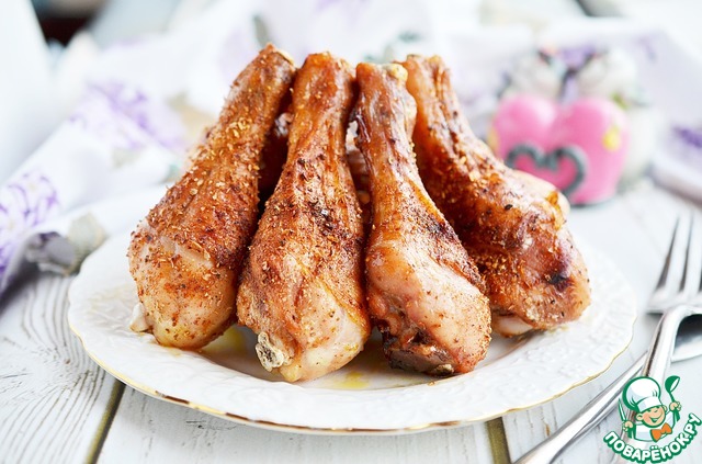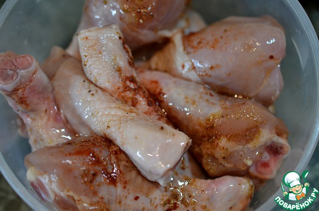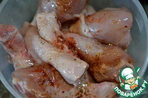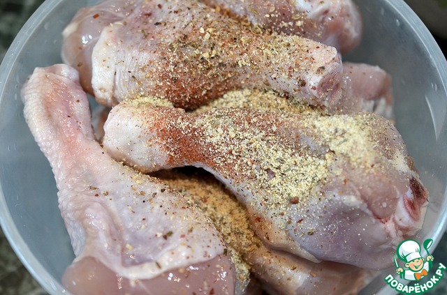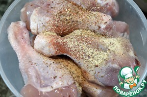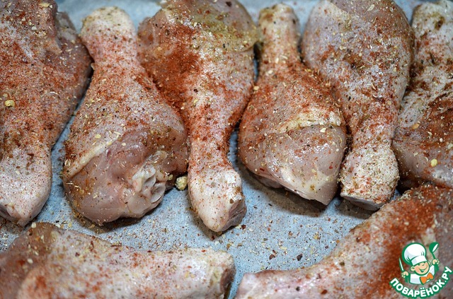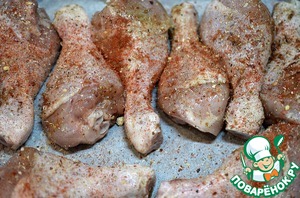 После этого курицу слегка обсушим. Выложим на противень и присыпем оставшимися специями.