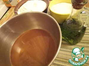 В миске смешиваем воду, молоко, дрожжи, соль, сахар, растительное масло, жидкий солод.