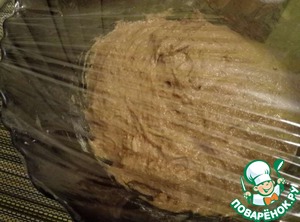 Перекладываем в посуду, которая по объему в 4 раза больше объема теста, затягиваем пищевой пленкой, протыкаем пленку в нескольких местах зубочисткой и ставим в прохладное место с температурой около 17-18 град. (я ставила возле балконной двери, открытой на проветривание) на 12 часов.