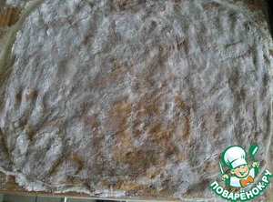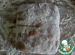 Рабочую поверхность присыпаем мукой и лопаточкой или скребком для теста вываливаем тесто. Сверху тоже немного присыпать мукой и аккуратно руками сформировать прямоугольник примерно 40см на 30см.