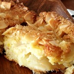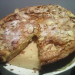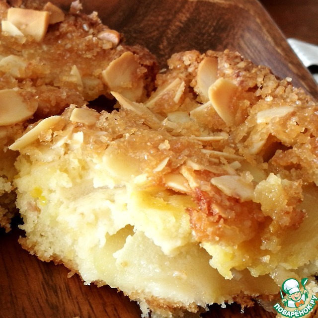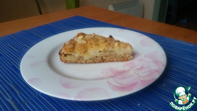 Все строго по рецепту, включая миндальную эссенцию. Пластинки миндаля насыпала от души! Яблок 2. Форма диаметром 24 см. Пирог получился довольно высокий, не плоский. Выпекался около 40 минут при температуре 180С. Снизу прекрасная золотистая корочка, по ней щелкнешь - она аж звенит.