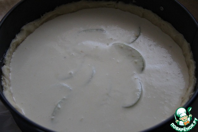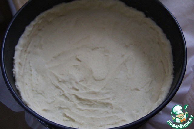 Тесто выложить в разъемную форму диаметром 22-24 см, размазывая лопаткой по дну и бортикам. Поставить на 20 минут в холодильник (я убрала в морозилку).