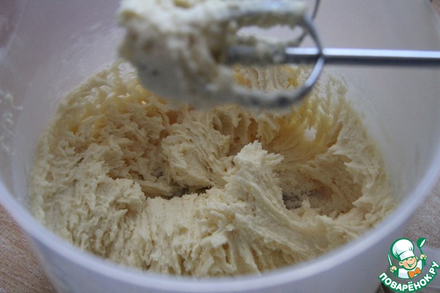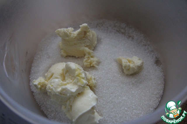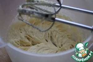 Тем временем готовим начинку: взбить масло с 1/4 стакана сахар (половина от требуемого количества) до пышного состояния.