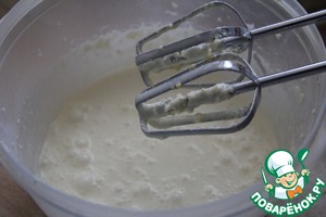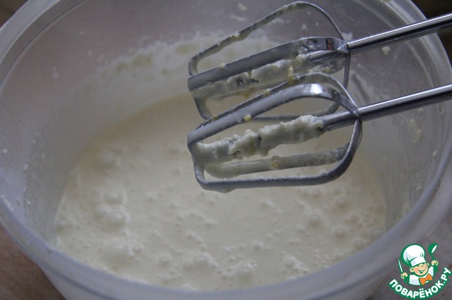 Снизить скорость миксера на минимум и добавить муку со сливками. Хорошо перемешать.