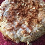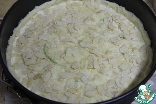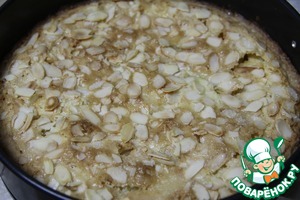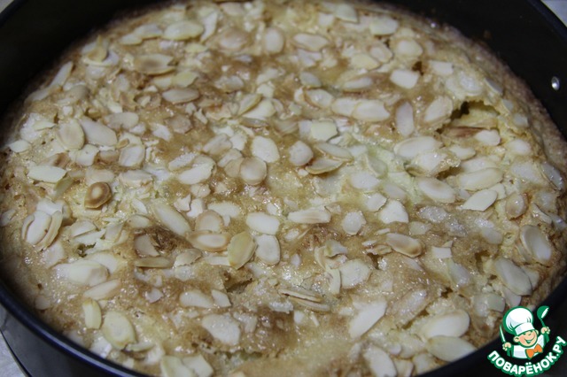 Посыпать оставшимся сахаром и лепестками миндаля. Я часть высыпала на тесто, потом насыпала лепестки и вновь сахар.