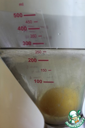 Вливаем растительное масло, уксус, добавляем сахар и соль, добавляем яйцо и смотрим на полученный объем. -