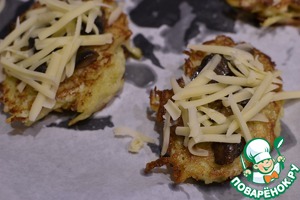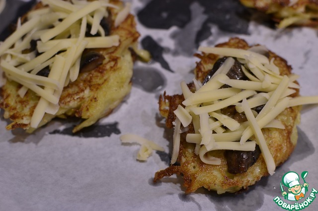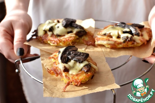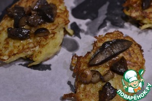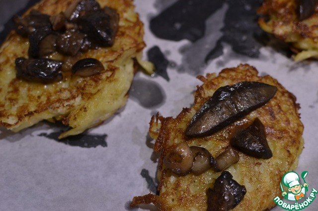 Ложкой выкладываем картофельную массу (стараемся не зачерпывать жидкость) в разогретое растительное масло, обжариваем оладьи до румяности с обеих сторон. Отдельно обжариваем нарезанные грибы.