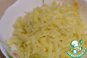 Трем на крупной терке картошку, добавляем яйцо, солим, перчим по вкусу, тщательно перемешиваем.