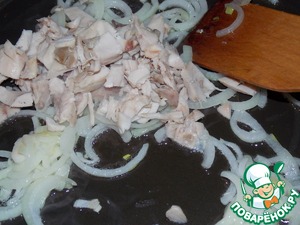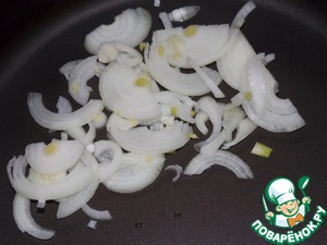 • Лук нарезать полукольцами и обжарить на растительном масле до золотистого цвета.