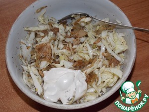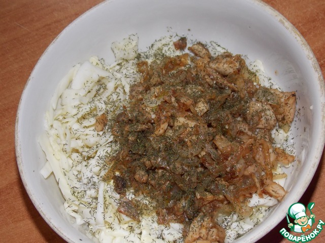 • Капусту тонко нашинковать, добавить курицу. Посолить и поперчить. Добавить укроп.