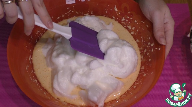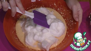 3. В желтковую массу перекладываем половину взбитых белков и все аккуратненько перемешиваем лопаточкой.