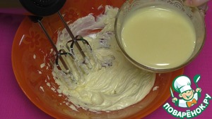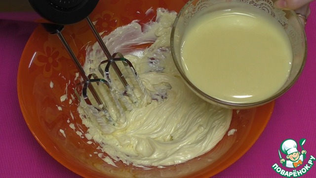 7. Готовый корж хорошо остудите в течении нескольких часов. А пока он остужается, займитесь приготовлением крема. Для этого взбейте 200 граммов сливочного масла с 360 граммами сгущённого молока.
