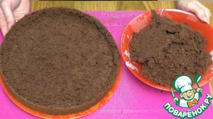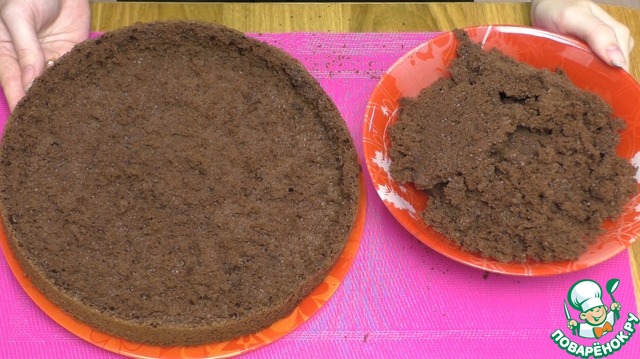 10. У остывшего бисквита аккуратно снимите верхушку, толщиной около 1 см. У вас должно получиться два коржа – тонкий и толстый. У толстого коржа аккуратно удалите середину, размельчите ее в крошку и разделите всё на две части примерно три к одному.