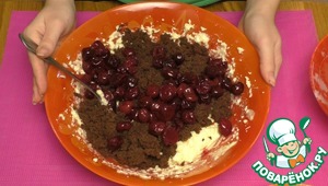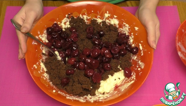 11. В готовый крем добавьте большую часть бисквитной крошки и процеженную вишню. Крем размешайте.