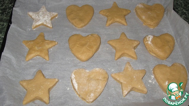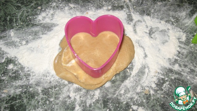 Присыпаем рабочую поверхность мукой, отрываем тесто катаем шарик, потом ладошкой его приплющиваем, но не тонко (около 1 см). С помощью формы вырезаем наше будущее печенье.