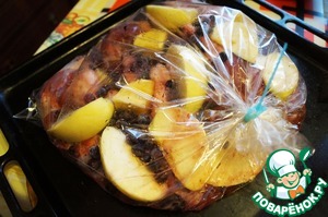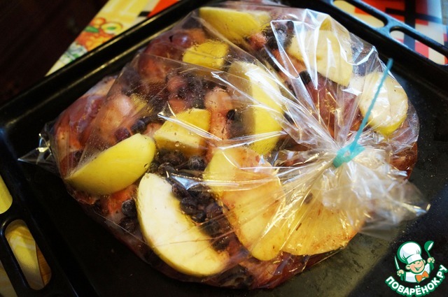 В пакет для запекания кладём аккуратно ножки, засыпаем сверху нарезанными на дольки яблоками, ягодами, наливаем немного вина. У меня остался кусочек кислого апельсина я и его отправила в пакет. Включаем духовку на 200 гр. и готовим примерно 45 минут до зарумянивания продуктов.