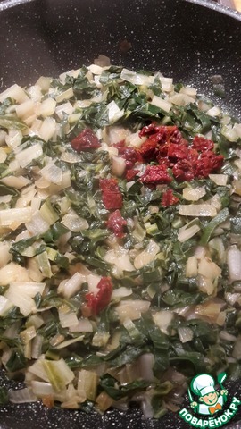Открываем крышку и видим эффект шпината - то, что было горой, стало скромной ароматной кучкой. Два вяленых томата (имеется в виду 2 половинки) измельчаем и добавляем к мангольду. Перемешиваем, сдабриваем черным молотым перцем, выключаем огонь и даем 5 минут настояться.