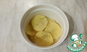 Форму для запекания смазать маслом. На дно выкладываем слайсы картофеля, посолить и поперчить.