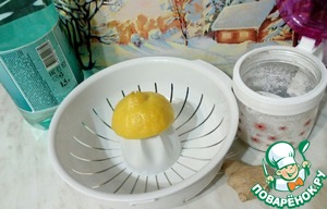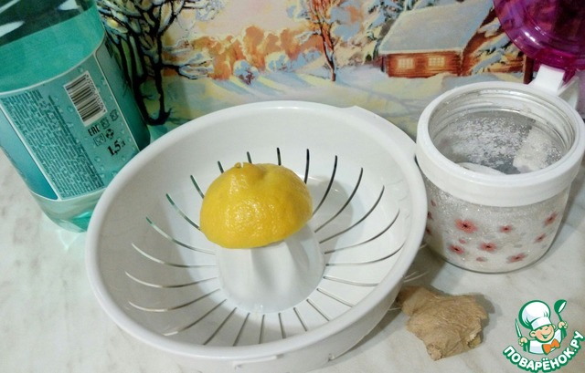 Теперь сделаем имбирное безалкогольное домашнее пиво. Для этого натрем имбирь, смешаем с сахаром и добавим сок одного лимона. Заливаем минеральной водой и оставляем на 5 минут. Теперь процедить и пиво готово. Мы будем использовать 500 мл.