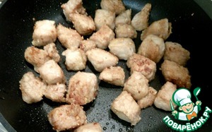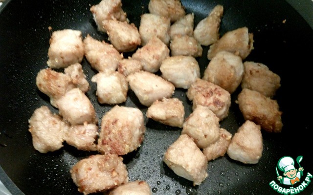 В пакет насыпать крахмал, выложить свинину, завязать и хорошо встряхнуть. Теперь свинину добавляем в сковороду к чесноку и имбирю. Обжариваем до золотистой корочки.