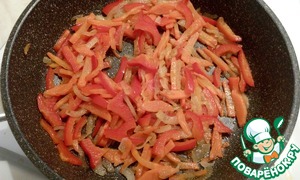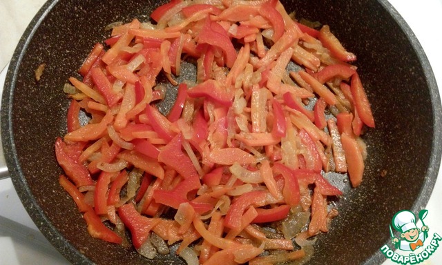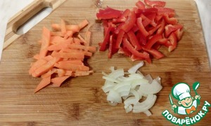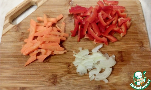 Лук нарезать четверть кольцами, морковь и перец соломкой.
